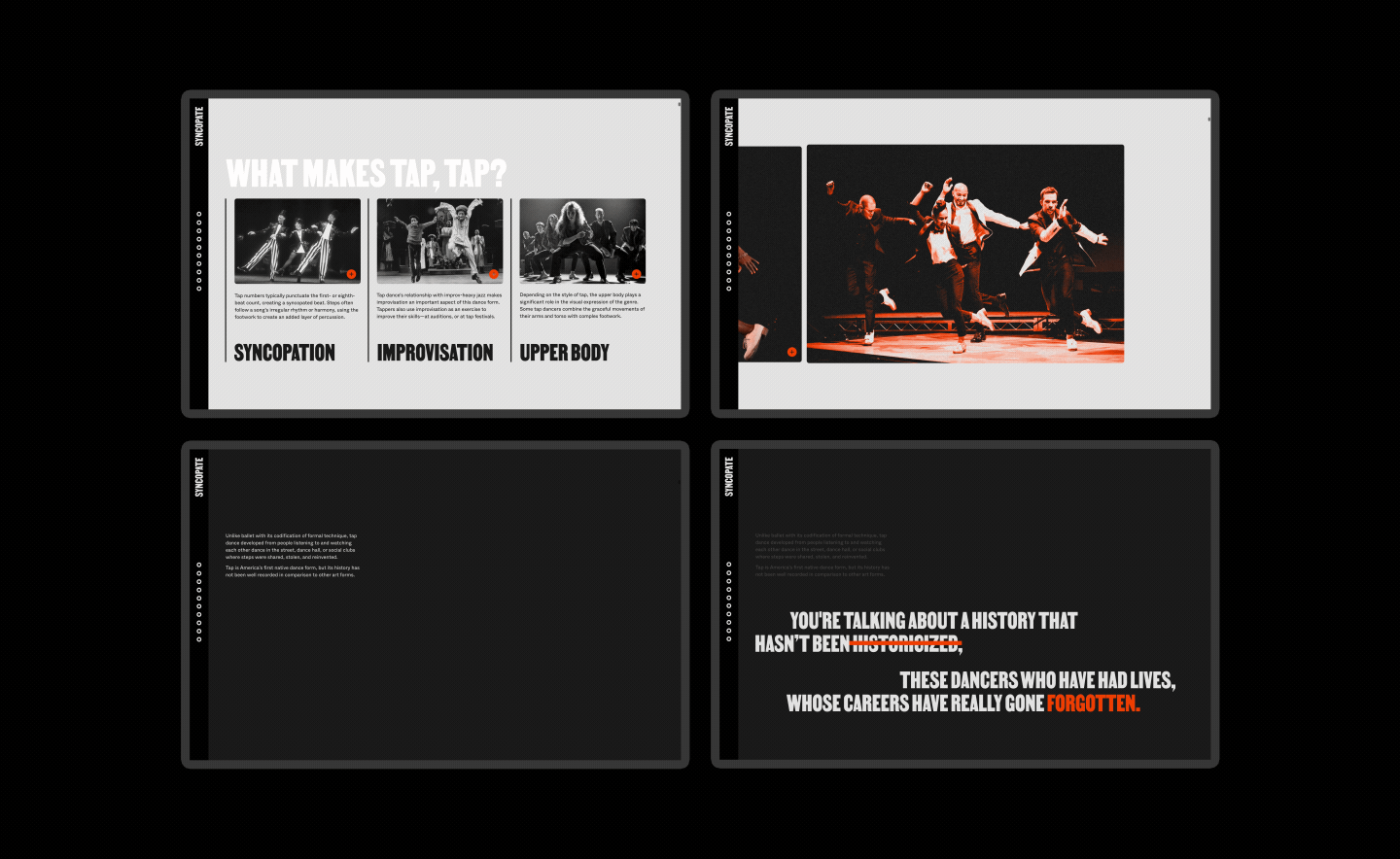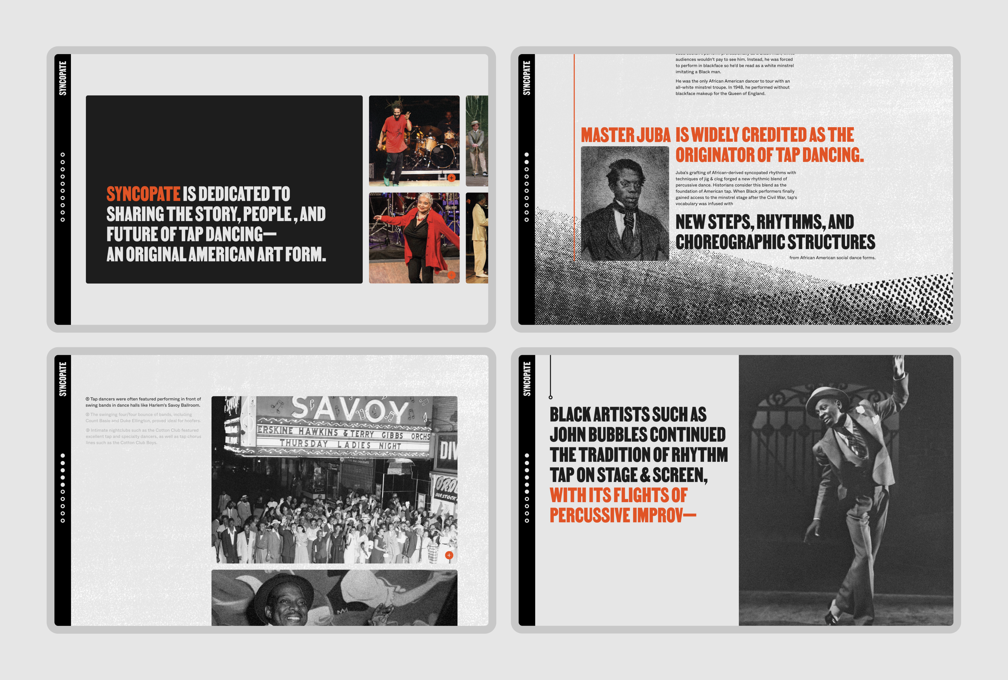 Syncopate is a digital experience that overviews the history of tap dancing through the events and performers who shaped it. Comprised of two components, The Story of Tap and The People of Tap, my project encourages public engagement, understanding, and ongoing support of this art form’s preservation.