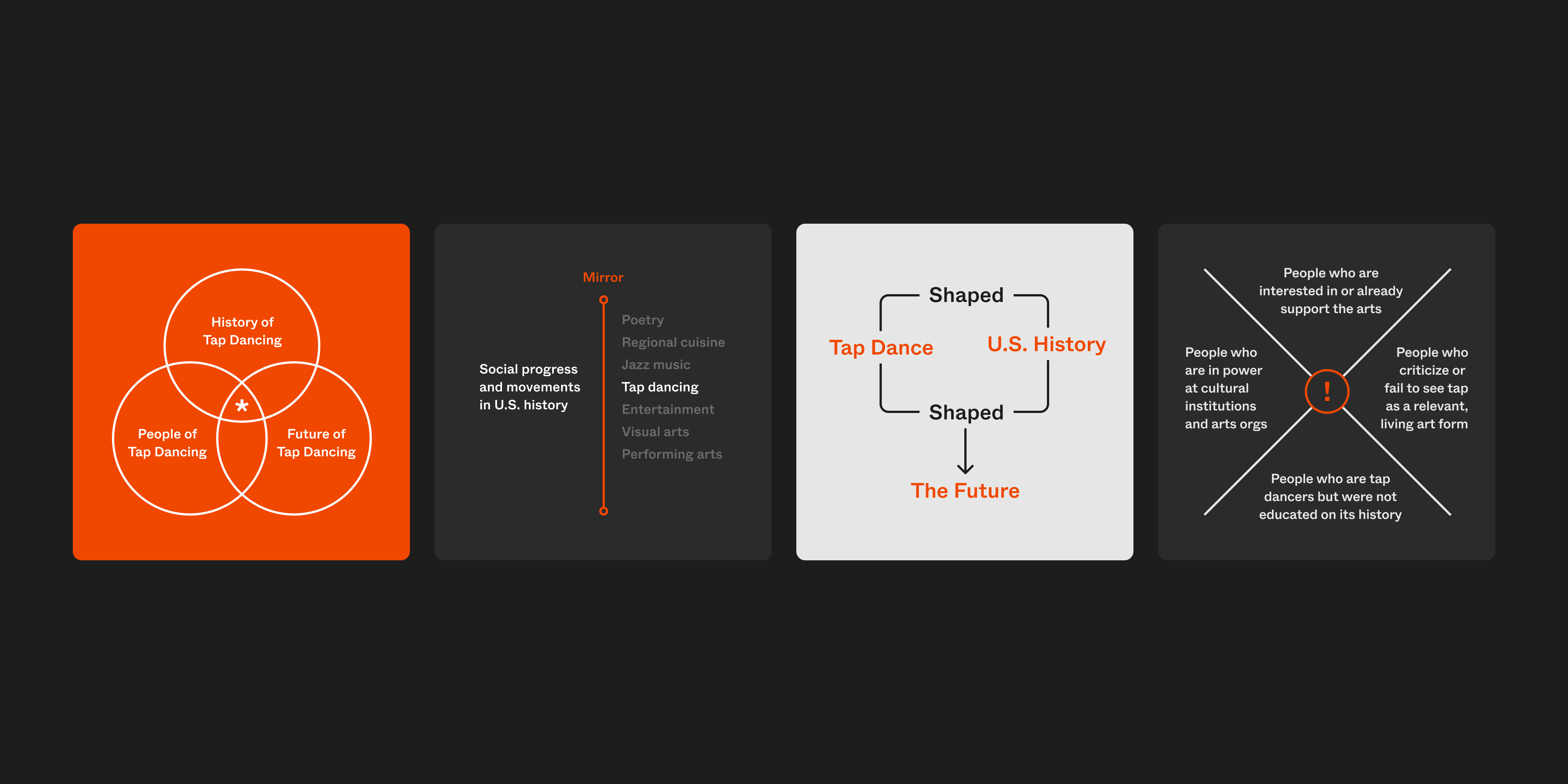This component of the project is a resource for those with limited exposure to tap history, built as an accessible entry point for communities where arts programming is scarce. Tap remained at the heart of every decision—from a typeface and palette inspired by its roots in social justice, to a kinetic design system mimicking its physical and musical attributes.
